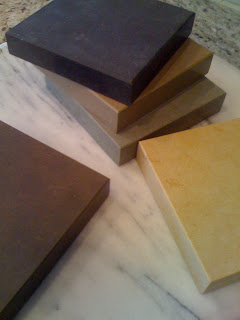 we are trying to pick out our counter tops. i thought this would be easy, usually i know exactly what i like, but this is more difficult than i expected. i like little variation, which is why granite is not my thing. i'm looking for one smooth color, but i want it to look natural. i love things like limestone and slate, but i keep hearing how porous and breakable they are so they are not practical. we have stacks and stacks of samples here. we came across a fairly new product called caesar stone. i think i like it. i am also thinking of going really dark with it, which is surprising me. i love my light colors. anyway, does anyone out there know anything about caesar stone? do you have it? we are doing our island in wood/butcher block, so this is just for the perimeter. and since you all are always so helpful...which of the small squares above do you like the best? i kind of like the one in the bottom left corner.